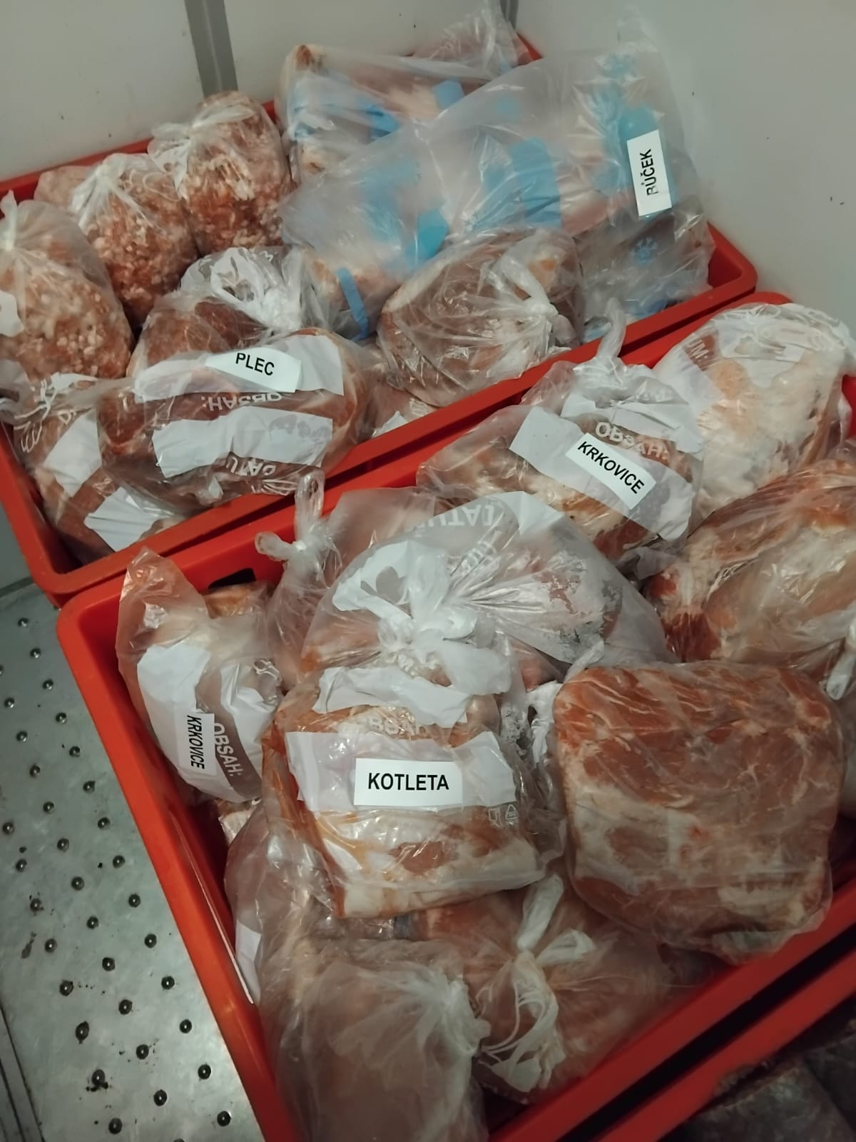 Nabízíme balíčky vepřového masa 10 kg – mix kotleta bez kosti 189 Kč, bůček 129 Kč, krkovice b.k. 189 Kč, plecko 169 Kč, kýta 169 Kč, mleté 169 Kč, kosti na polévku 49 Kč. Celková cena závisí na přesném složení. Mimo balíček je možnost si objednat panenku 299 Kč za kg.